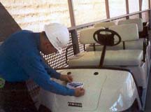 cart. Pete places the Amtrak logo on the cart.