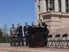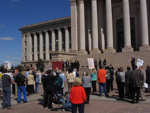 Passengerailok.org leader Evan Stair leads the rally with prominent city mayors |
