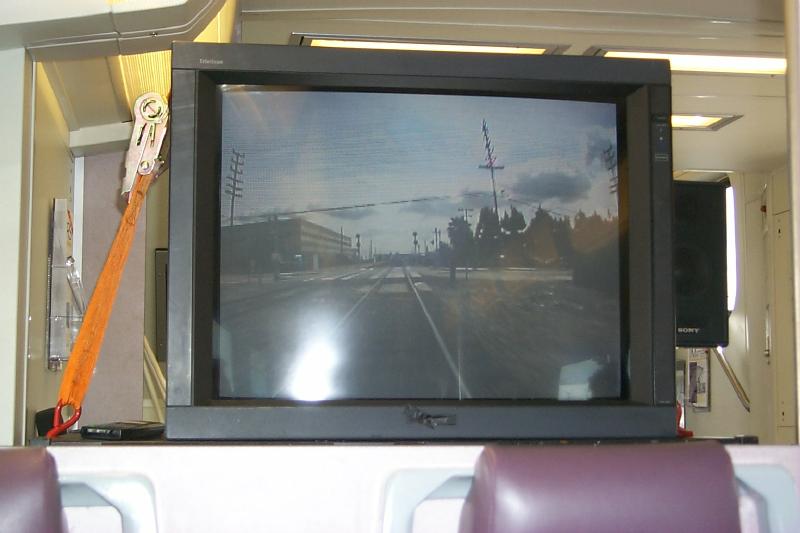 Here, a grade level crossing is observed from the camera on the front of #613. All passengers were able to get a good feel for what the engineer sees. As I sat with the passengers, many of them related how "nerve wracking" it is watching the cars cross ahead of the train. |
