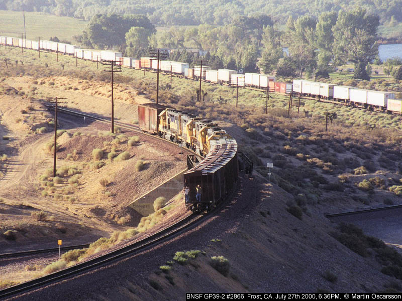 BNSF GP39-2 #2866 and three other Geeps with a local train at Frost, CA, July 27th 2000 at 6:36PM.