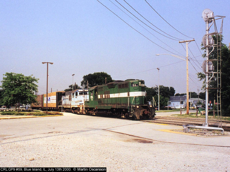 59 CRL GP9 #59 and GP18M #15 switching at Vermont Street, Blue Island, IL, July 13th 2000.