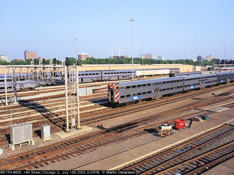 Metra cabcar #805 leads a commuter train at 14th Street, Chicago, IL, July