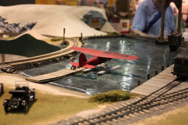 This Bend Track module is a 90 degree corner that contains yet another bridge, which is the only bridge that does not open on the layout. There is airmail service to the islands by seaplane.