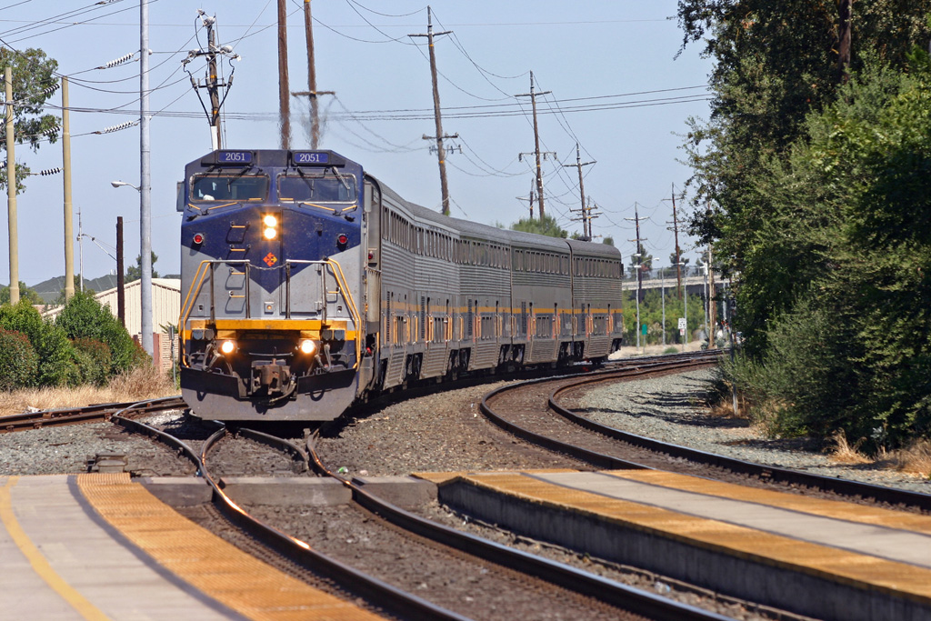 Amtrak California 2051 Leads WB Capitol Service train into Davis, CA
