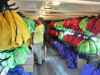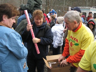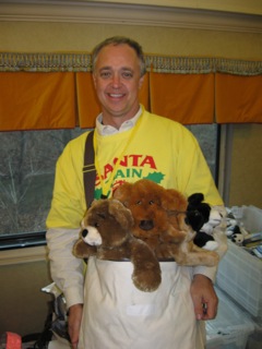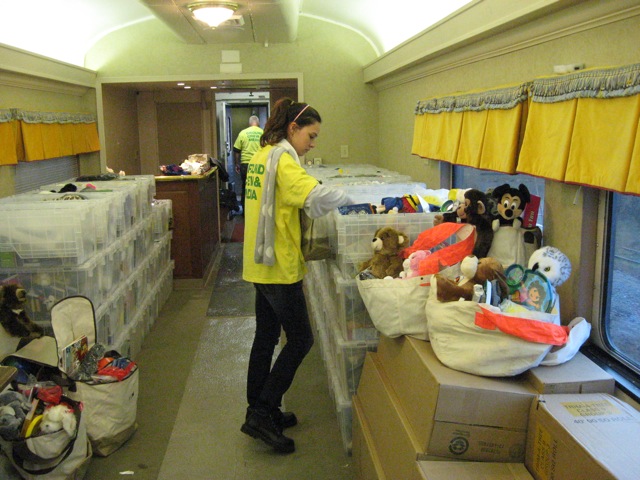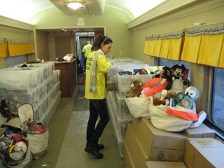 ![]() A volunteer fills burlap bags with toys and stuffed animals for the next stop. |