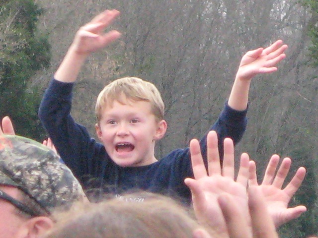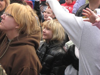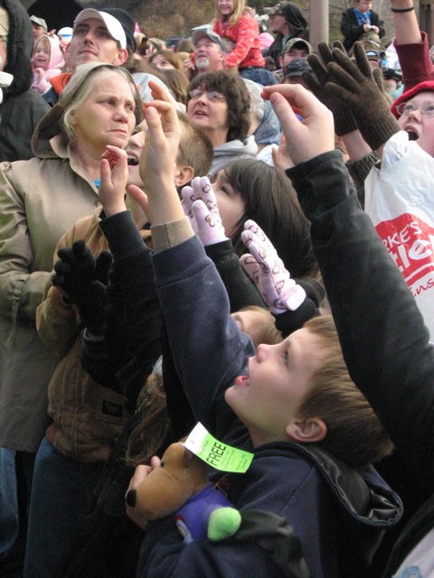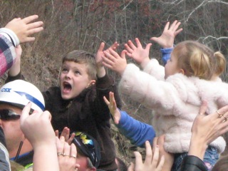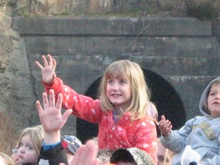 ![]() Kids reach to the sky in hopes of catching a prize tossed from the rear of the train. |