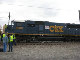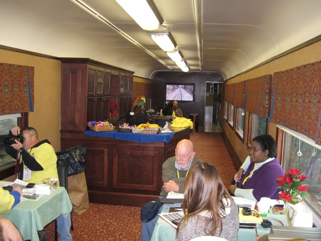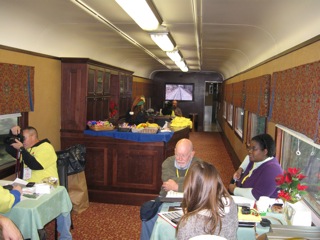 CSX office car "Tennessee" was home base for invited media. This car serves as a cafe/lounge/dining car. Note the large screen at the end of the car which projects live video from the train's rear platform (below).