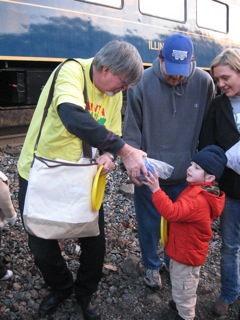 ![]() Color coded bags handed to children at the Santa Train's stops are color coded by children's age and gender. |