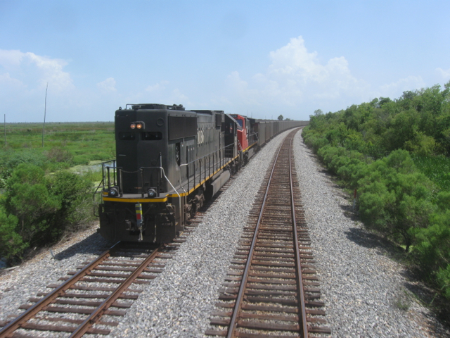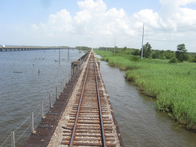The rear view from the City’s sleeper shows Lake Pontchartrain and I-55 (left), and marshes on the right