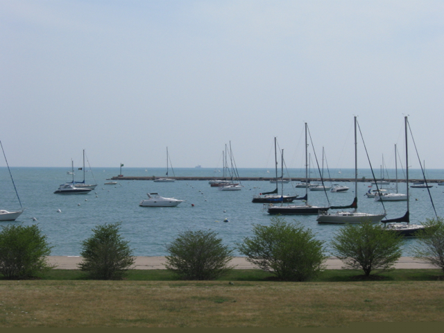Sailboats anchored in a harbor along Lake Michigan