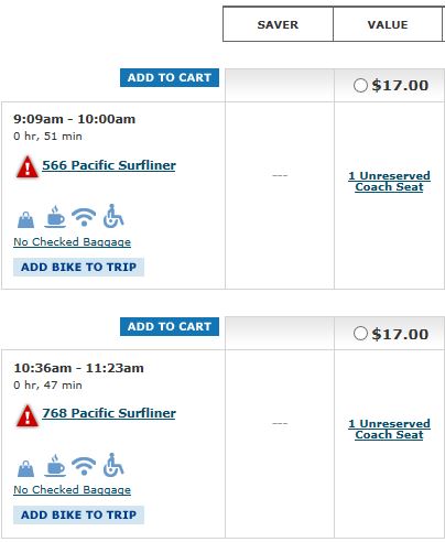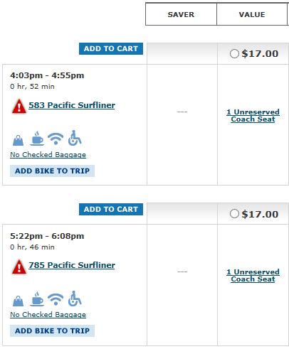 With a built in overnight in Orange County as a deviation from the Southwest Chief and then Coast Starlight (full report here), I had made plans to visit San Clemente and the famous pier. Getting to San Clemente from Anaheim was easy; getting to the pier and back on the Surfliner required a little more planning. In short, only two Pacific Surfliners stop at the pier on a daily basis in either direction (get the full schedule here). The below samples snipped from www.amtrak.com for October 6th, 2015 show example schedule and pricing. Not knowing when I would get in to Anaheim from Fullerton caused me not to buy tickets ahead of time and missed taking advantage of AAA pricing, but rather purchase them at the ARTIC at full retail show below.