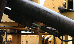The blades were raised and lowered by means or either an air of hydraulic cylinder. On the early models, as well as the 2-180 and 2-150s, the side wraparound wings had a chain leading to the rear corners to make sure the entire assembly lowered evenly. This was replaced by a steel cable on everything else. These chains/cables were attached to a cross head at the cylinder so everything worked in unison. On the 2-200 and 2-210 models with the large angled blades, the cylinder was also angled back.