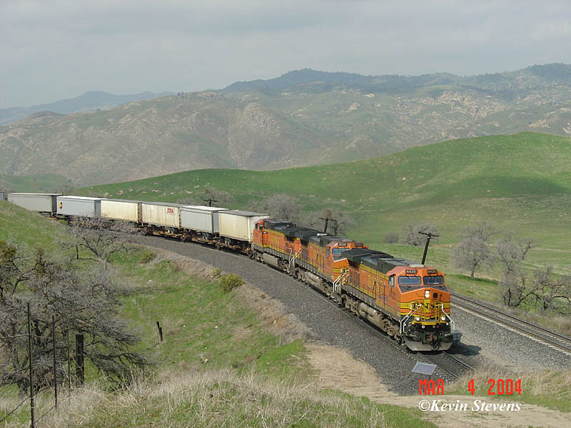 A Northbound BNSF intermodal is shown approaching the Tehachapi Blvd crossing just East of the cement plant.