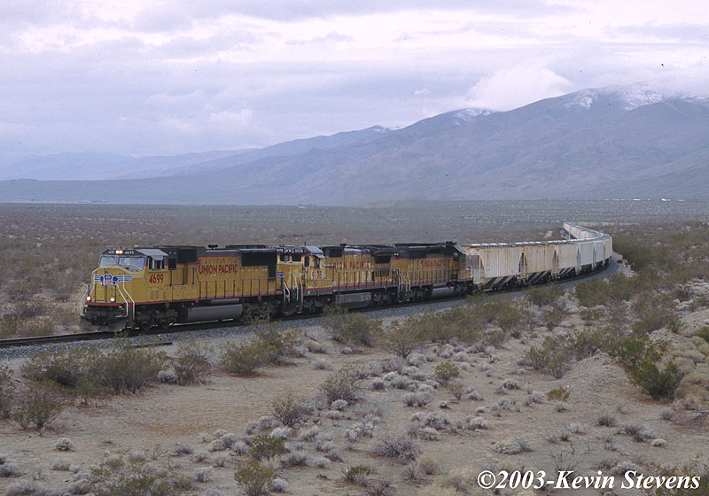 A train bound for the Trona Railway junction at Searles is shown crawling uphill North of Cantil.
