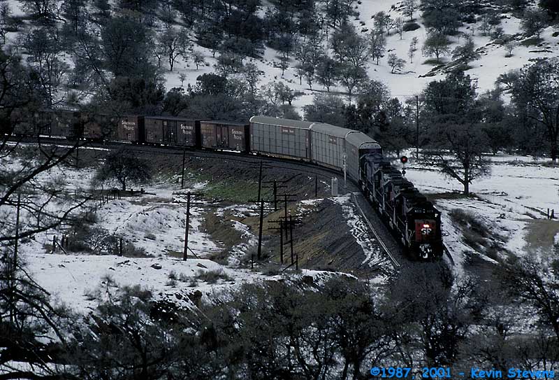 Although Tehachapi isn't known for snow, it does get some from time to time. This view is of a Westbound SP train that has just passed around the loop at Walong.