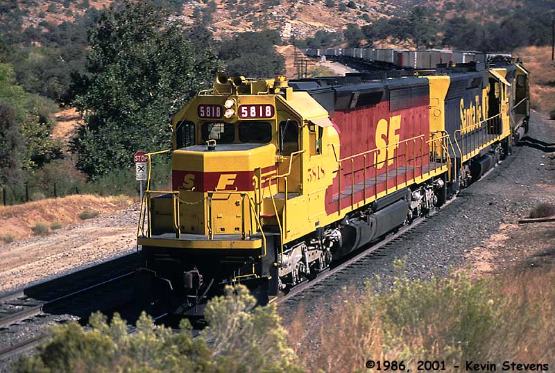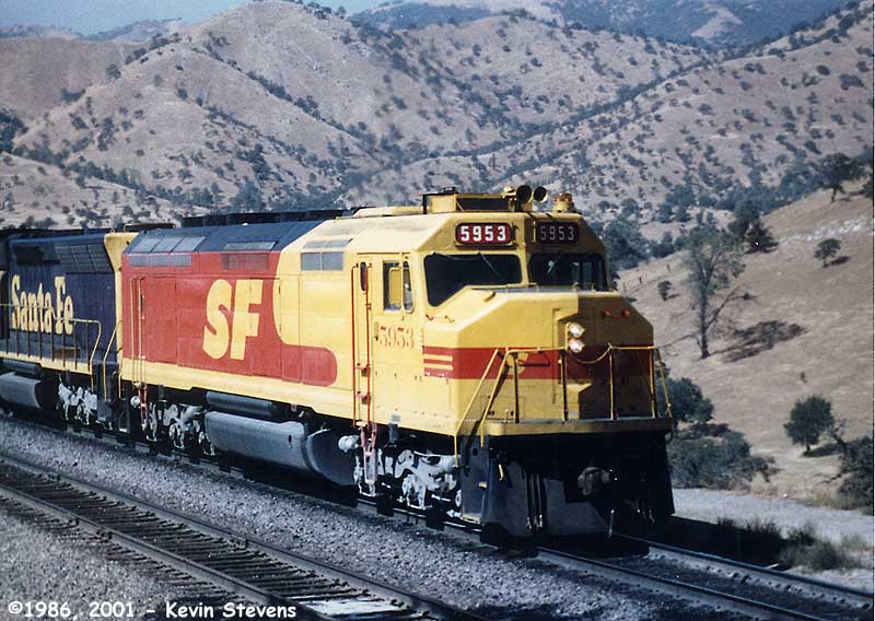 More than 13 years after the denial of the merger which created it's colors, SP SD40R #7357 still wears the ill-fated SPSF image. Although nearing 20 years since it's last major rebuild and 35 years since being built, this unit still earns it's keep for new parent Union Pacific every day. It spent a couple of weeks in October of 1999 in captive duty hauling general merchandise back and forth over Tehachapi Pass. With UP's new power orders, 7357 and other older power will probably find themselves out of a job soon.