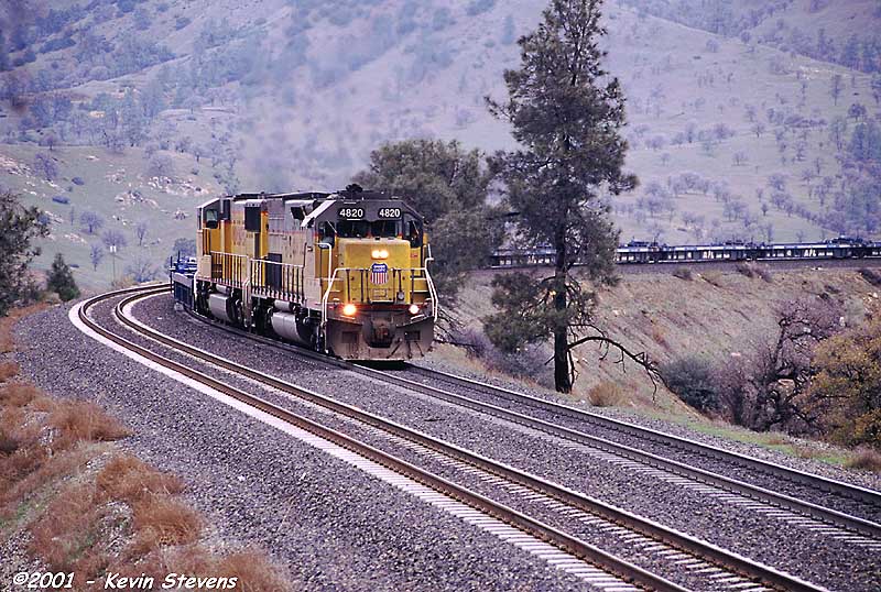 Due to wet weather and related mudslides and washouts, UP detoured several trains down the Central Valley and over Tehachapi Pass that usually traverse the Coast Line. One such train was the Oakland to Long Beach baretables, shown on the Loop at Walong.