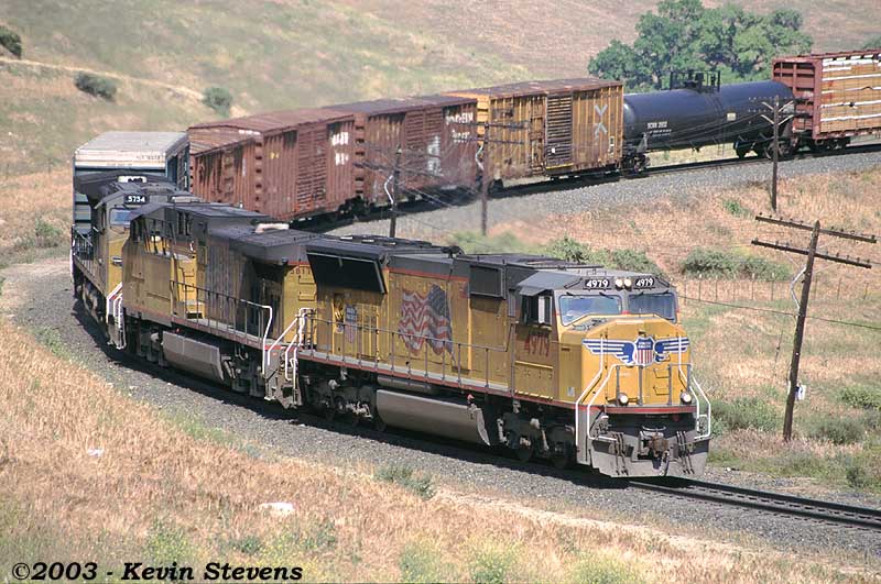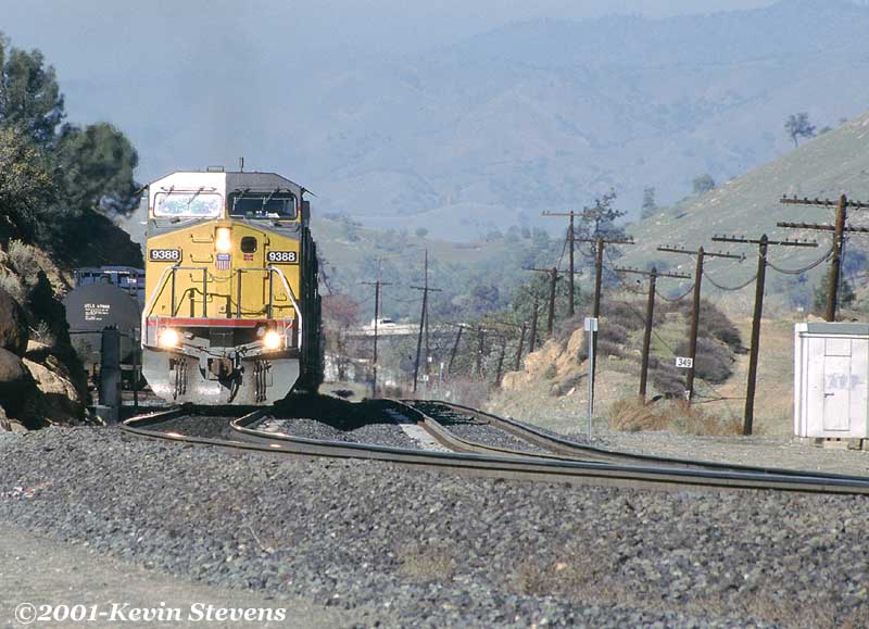 One of the most reliable schedules over Tehachapi is UP's Z-SELC which usually heads East out of Bakersfield in the mid-day hours. Here, the train is shown rolling uphill through Woodford led by one of UP's new SD70M's.