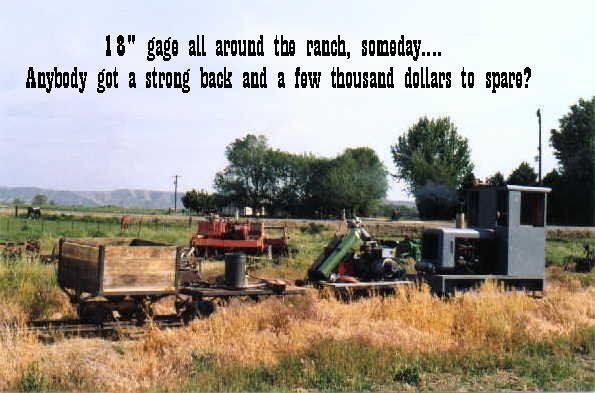Being as my brother Robert was volunteering on the Sumpter Valley Railroad and I then started in 1994, I drew up plans for a three foot gauge railroad. I figured I could use the same size trains, just widen the gauge for possible interchange service with another railroad 125 miles away. I wanted it to be useful, so drew plans for it to go by our stock shoot on the ranch like I'd seen in pictures of Colorado trains, but I LOVED trolleys (Mr. Rogers and Mariott's Great America did that to me!) So the 'Cottonwood Tramway' was mainly a trolley line on our loop of driveways with 50' radius curves. It would have been great, but where and how could I get a three foot gauge trolley with no money down and no payments? Back to dreaming.... I envisioned the 'Cottonwood Extension Railroad' all around the ranch, a mile of track with curves large enough to run a real steam engine!