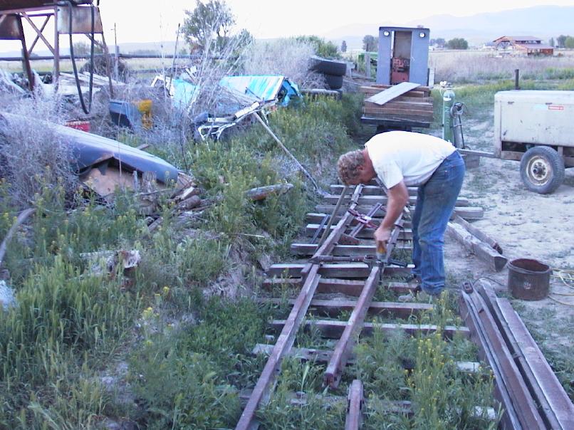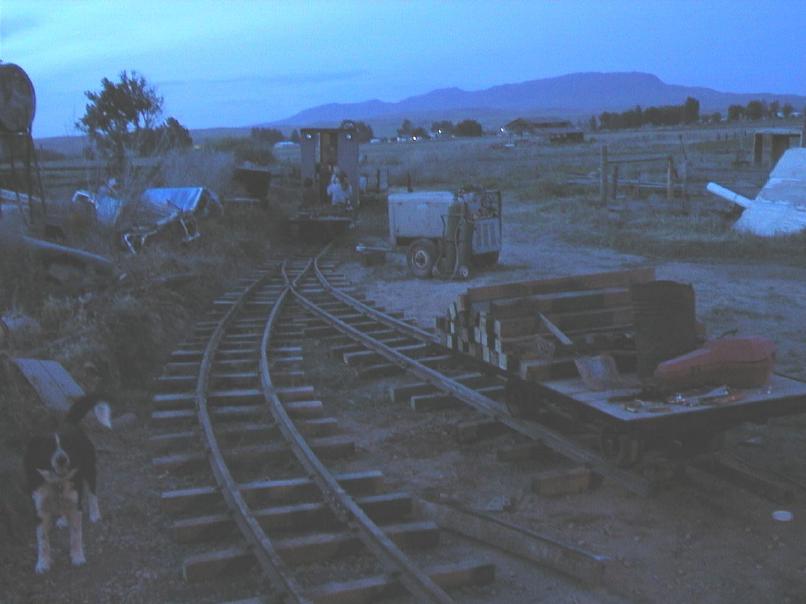 Our first switch was installed a few days before, a feat that could consume a web page in itself. The switch was one salvaged from an abandoned mine and quite corroded. It also was designed solely for use by push cars: Though a number 4 frog, there was no curve in the closure rails (the rails between the frog or crossing of the rails and the movable points of the switch) so the points contacted the stock (outside) rails at this same #4 angle (WAY too sharp for a loco to cross). The frog itself also needed work as it was designed for small mine car flanges, not the cut down standard gauge wheels we use. I didn't take pictures of it, but here is a basic synopsis: