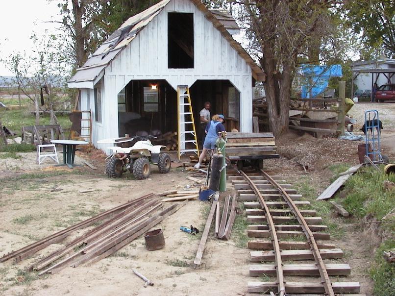 Now everyone can see why we put two small doors on our building instead of a single 16' wide rollup, it really looks like the two track engine house it is! To the left is some of the heavily corroded 20 pound mine rail from the original 'roller coaster' we will probably use on a siding somewhere.