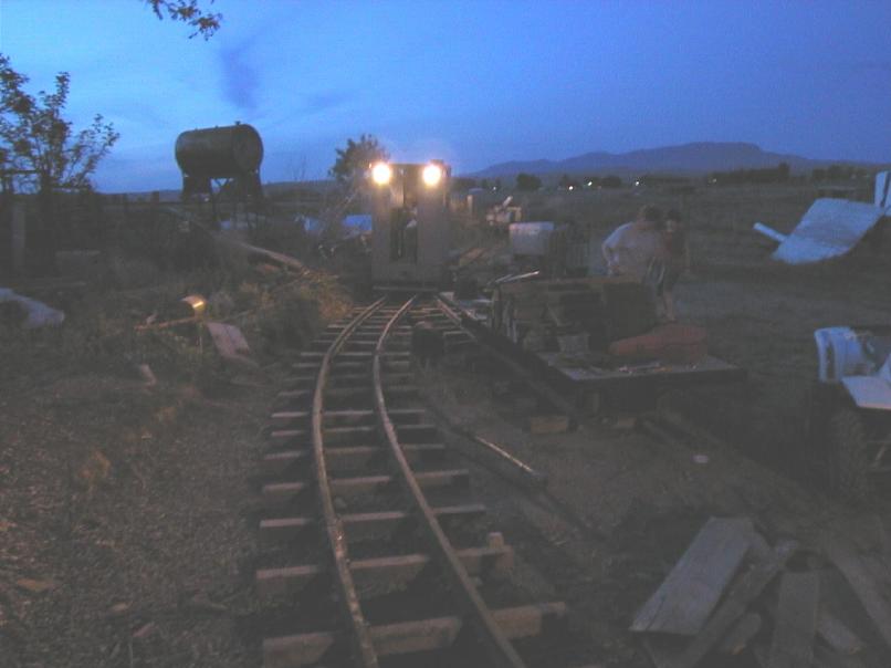 Back at it on Saturday night the 12th of May. The compromise joint on the #2 engine house track is progressing. Notice how interweaved our ties are near the switch. At 4' long they are longer than 'scale', reduce the need for switch length ties and stabilize the track well on our sometimes soggy ground. We only need four longer ones for each switch. Also note that we had to build all the 35 pound track in straight sections, attach it with heavy joints and curve it after it was attached.