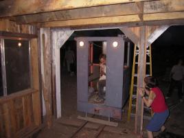 9:27pm. Rollie and little Zayne take the maiden voyage as Randi looks on. A tighter fit than we thought! Notice the horns on the right side of the cab roof, they barely make it through the 8 ' tall doorway.