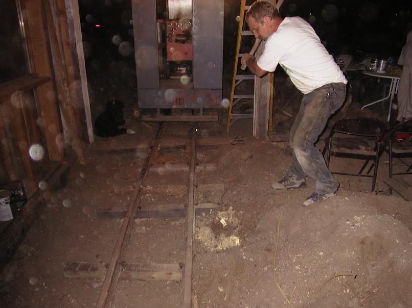 Work is progressing well by Tuesday the 8th and here Della, Zayne (next to her) and RJ take a break on the tie car while Rolly is digging out the engine house floor for the temporary 4x4 ties (later to be replaced with steel channel ties when the concrete floor is poured). Sparky is keeping a wary eye for errant cats that need to be chased....