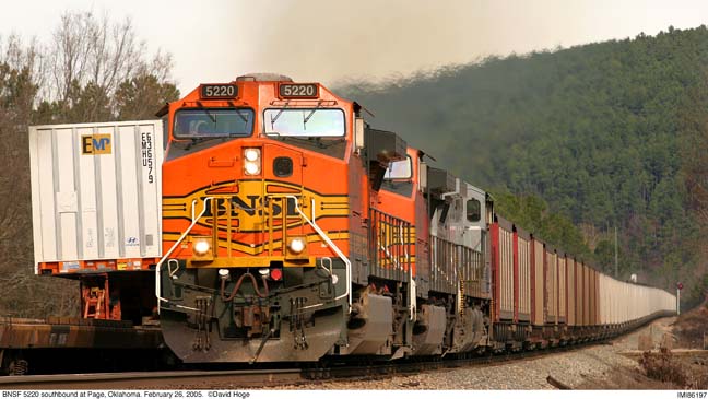 BNSF 5220 with coal train passes manifest in the siding at Page, Oklahoma. February 26, 2005