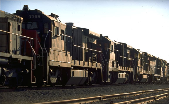 SP 7768 and other locomotives in deadline at Cotton Belt yard in Pine Bluff, Arkansas. November 26, 1995.