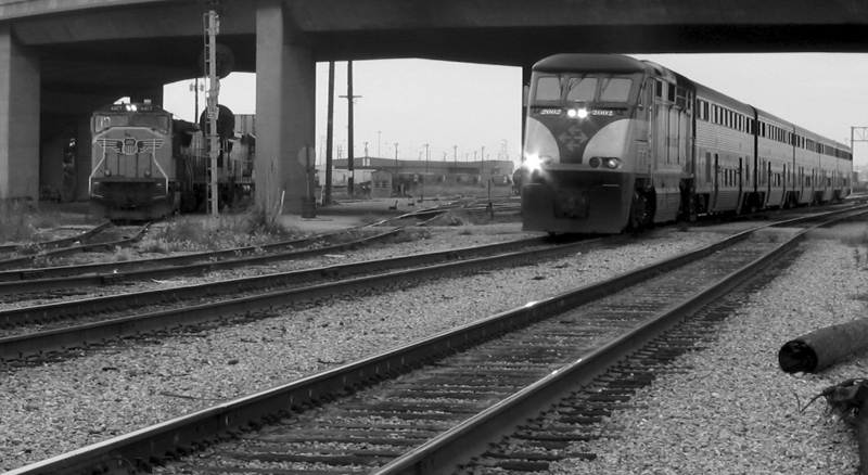 An Amtrak California train rolls through Oakland's CP Magnolia where a Union Pacific intermodal waits to depart. December, 2003.