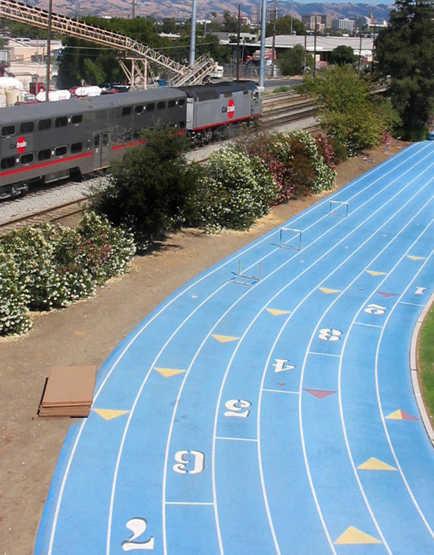A southbound Caltrain passes Bellarmine High School's track. August, 2004.