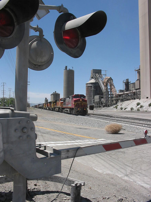 Unadulterated ATSF power leads an eastbound past the Monolith cement plant on Tehachapi Pass. This may sound like a lame joke, but it actually happened: that tumbleweed stopped rolling just as the crossing arm went down. May, 2004.