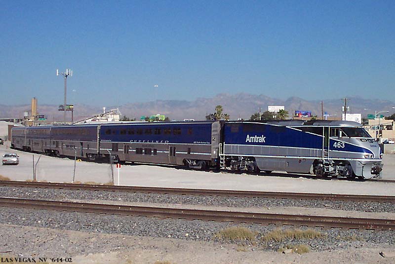 I managed to convince the guard at Main Street Station, a casino in Vegas, to allow me to shoot form their employee parking lot directly across from where I found the Amtrak tied up. A high 8 foot fence, with that green material stuff covering it, stood between me and the prize. Real foamers stand on the roof of their trucks!