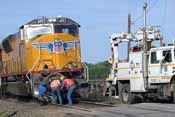 This UPRR page has been created to relieve overcrowding on the main train wreck page. Below you will find pictures of wrecked locomotives, rolling stock and other crash related items that have occurred on UPRR lines. Click on a Thumbnail to View larger image. * after thumbnail denotes image added at latest update given above. All Images are copyrighted. Use for profit by permission only.