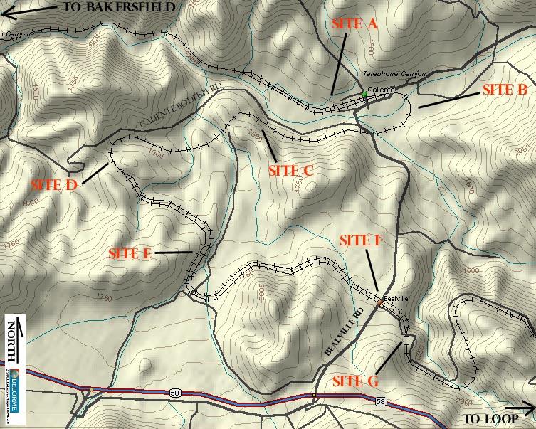 Site C: This area is just below Tunnel 1, and provides some of the best views of the trains coming uphill from the valley. The horseshoe is in plain site and the trains often pull in right behind the one that is passing you. Downhill (west) trains can sneak up on you here so be ready. Morning light for westbound trains and afternoon sun for east. To access turn left onto Caliente - Bodfish road immediately after going under the rail bridge, and use the dirt roads on your left. They are pretty steep, but I have made them in cars.