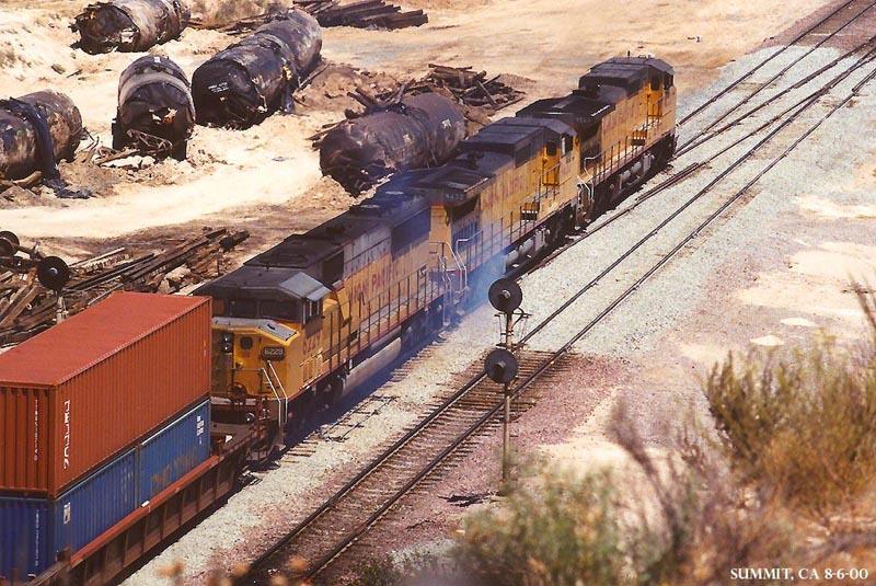 UP 6299 passes tanker cars smashed in a wreck earlier in the week. People I talked to said some SP helpers were not able to stop in time to avoid colliding with a downhill BNSF train at summit's crossovers. Oops! You can see the new ballast and track at the crossovers. Check later for more wreckage pix. Also note the burning brakes on the 2nd unit, UP 9432.