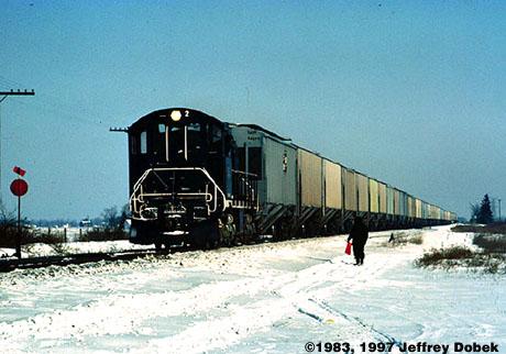After a connection was made with the GTW at Riga, the LCRC handled unit trains to the Blissfield Co-op. Here #2 is ready to take empties from the GTW. (12/29/83)