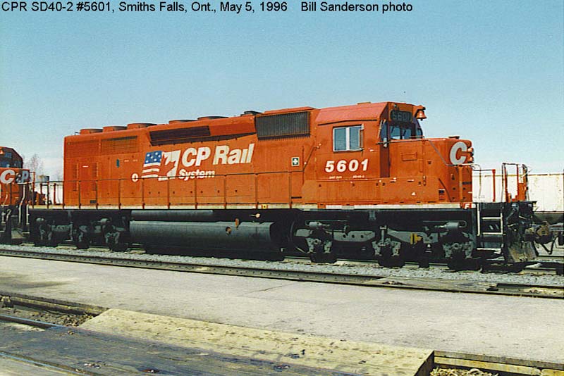 Other Photos (chronological) : 1. CP 5601 at Montreal, QC., painted in the CP Rail Large Multimark paint scheme. Photo by Bruce Chapman, 1980. From the Bill Sanderson collection; 2. CP 5601 at Smiths Falls, ON., painted in the CP Rail no-Multimark paint scheme. Photo by Bill Sanderson, 1990.