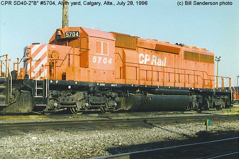 Other Photos (chronological) : 1. CP 5704 at Montreal, QC., painted in the CP Rail Large Multimark paint scheme. Photo by Bruce Chapman, 1977. From the Bill Sanderson collection; 2. CP 5704 at Smiths Falls, ON., painted in the CP Rail no-Multimark paint scheme. Photo by Bill Sanderson, 2001.