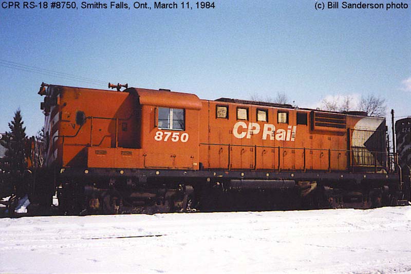 Other Photos (chronological) : 1. CP 8750 at Ottawa, ON., painted in the Maroon & Grey "Script" paint scheme. Photo by Bruce Chapman, 1967. From the Bill Sanderson collection; 2. CP 8750 at Montreal, QC., painted in the CP Rail Large Multimark paint scheme. Photo by Bill Bainbridge, 1975. From the Bill Sanderson collection; 3. CP 1841 at Sault Ste. Marie, ON., painted in the CP Rail no-Multimark paint scheme. Photo by Bill Sanderson, 1997.