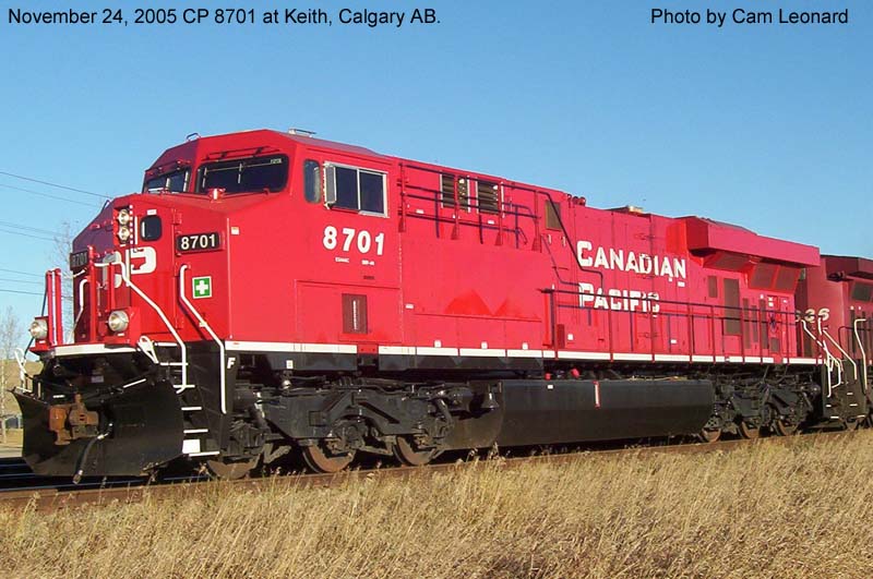 Built by : General Electric Built in : 2005 Serial Number : 55957 Class : DRF-44 Paint Scheme : Canadian Pacific This Photo : Cam Leonard, 2005 Other Photos (chronological) : 1. CP 8701 at Port Coquitlam, B.C., painted in the Canadian Pacific paint scheme. Photo by Mark Forseille, 2006. Notes : none ___________________________________________________________________________________________
