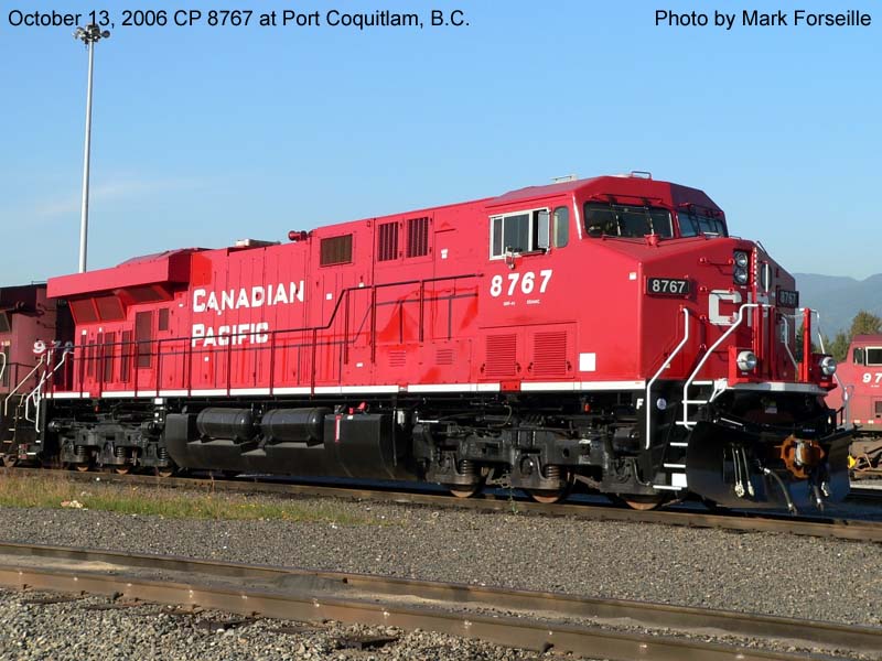 Other Photos (chronological) : 1. CP 8767 at Winnipeg, MB., painted in the Canadian Pacific paint scheme. Photo by A. Ross Harrison, 2008; 2. CP 8767 at Port Coquitlam, B.C., painted in the Canadian Pacific paint scheme. Photo by Mark Forseille, 2010.