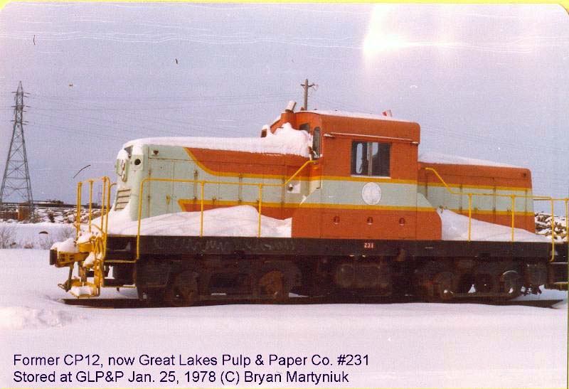 Other Photos (chronological) : 1. GLP&P 231 (ex-CP #12) at Thunder Bay, ON., painted in the Ex-CP Maroon & Grey "Block" paint scheme. Photo by Ken Annett, 1975. From the Bill Sanderson collection; 2. GLP&P 231 (ex-CP #12) at Thunder Bay, ON., painted in the Ex-CP Maroon & Grey "Block" paint scheme. Photo by Bryan Martyniuk, 1978; 3. GLP&P 231 (ex-CP #12) at Thunder Bay, ON., painted in the Ex-CP Maroon & Grey "Block" paint scheme. Photo by Bryan Martyniuk, 1978.