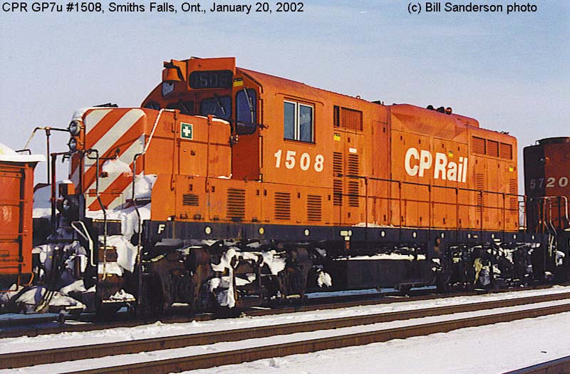 Notes : Built by GMD as GP7 #8423 (1953). Rebuilt by CP as GP7u, chop-nosed and renumbered to #1508 (1982). Retired (8/29/2012). Sent to SRY, New Westminster B.C., for parts salvage and scrapping. ___________________________________________________________________________________________