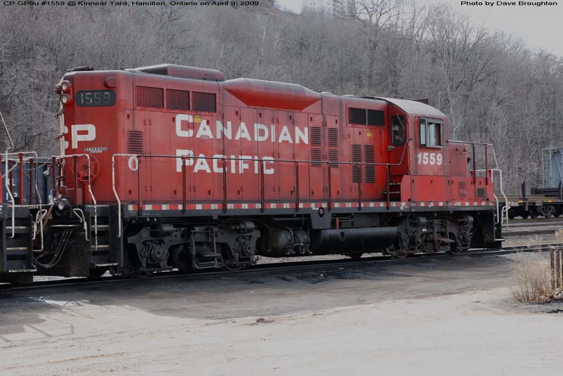 Other Photos (chronological) : 1. CP 8540 at Wilkie, SK., painted in the CP Rail Large Multimark paint scheme. Photo by R.A. Matthews, 1979. From the Bill Sanderson collection; 2. CP 1559 at Alyth, Calgary AB., painted in the CP Rail Small Multimark paint scheme. Photo by Bruce Chapman, 1990. From the Bill Sanderson collection; 3. CP 1559 at Alyth, Calgary AB., painted in the CP Rail no-Multimark paint scheme. Photo by Bill Sanderson, 1993; 4. CP 1559 at Alyth, Calgary AB., painted in the CP Rail System paint scheme. Photo by Bill Sanderson, 1998; 5. CP 1559 at Oshawa, ON., painted in the Canadian Pacific paint scheme. Photo by Tom Twigge, 2005.