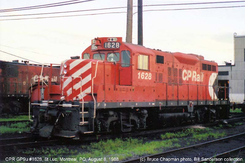 Notes : Built by GMD as GP9 #8701 (1957). Rebuilt by CP as GP9u, chop-nosed and renumbered to #1628 (1986). Equipped with CANAC remote control 'beltpack' equipment. Mated with Slug #1021. Retired (10/25/2012). Moved to SRY, New Westminster, B.C., for dismantling and scrapping. ___________________________________________________________________________________________