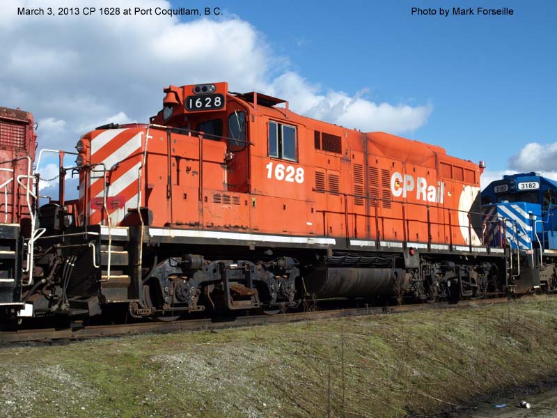 Other Photos (chronological) : 1. CP 8701 at Montreal, QC., painted in the CP Rail Large Multimark paint scheme. Photo by Jean Patenaude, 1974. From the Bill Sanderson collection; 2. CP 1628 at Montreal, QC., painted in the CP Rail Small Multimark paint scheme. Photo by Bruce Chapman, 1988. From the Bill Sanderson collection; 3. CP 1628 at Winnipeg, MB., painted in the CP Rail Small Multimark paint scheme. Photo by A. Ross Harrison, 2012; 4. CP 1628 at Port Coquitlam, B.C., painted in the CP Rail Small Multimark paint scheme. Photo by Mark Forseille, 2013.