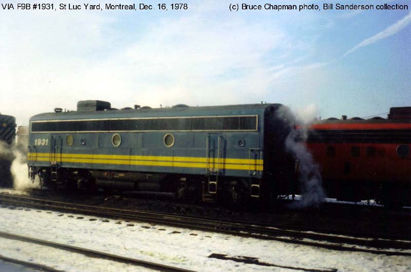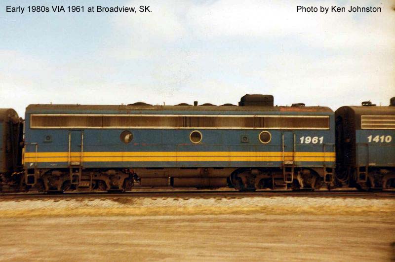 Other Photos (chronological) : 1. VIA 1931 at Montreal, QC, painted in the VIA Yellow/Blue paint scheme. Photo by Bruce Chapman, 1978. From the Bill Sanderson collection; 2. VIA 1961 at Vancouver, B.C., painted in the VIA Yellow/Blue paint scheme. Photo by Claude Prutton, 1979; 3. VIA 1961 at Broadview, SK., painted in the VIA Yellow/Blue paint scheme. Photo by Ken Johnston, early 1980s.