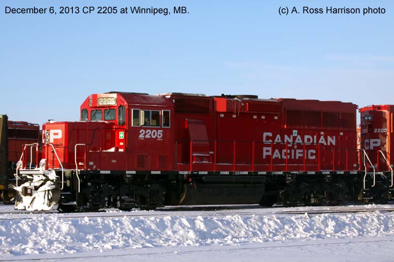 Other Photos (chronological) : 1. CP 2205 at Winnipeg, MB., painted in the Canadian Pacific paint scheme. Photo by A. Ross Harrison, 2013; 2. CP 2205 at Winnipeg, MB., painted in the Canadian Pacific paint scheme. Photo by A. Ross Harrison, 2014; 3. CP 2205 at Winnipeg, MB., painted in the Canadian Pacific paint scheme. Photo by A. Ross Harrison, 2015.